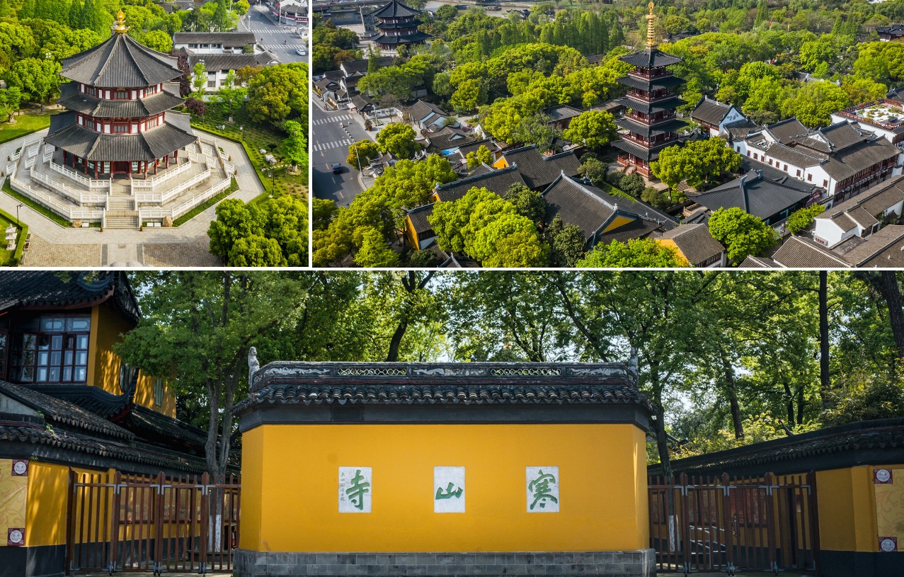 寒山寺 寒山寺位於蘇州西郊,已有一千四百多年的歷史,因唐代詩人張繼的名詩《楓橋夜泊》中「姑蘇城外寒山寺、夜半鐘聲到客船」一句而聞名天下。寒山寺是有名的祈福勝地,每天來寺中撞鐘進香、祈求平安的信徒絡繹不絕。 寒山寺主要由大雄寶殿、鐘樓、碑廊、藏經樓等建築組成。大雄寶殿內高大的須彌座以漢白玉雕築,座上安奉釋迦牟尼佛金身佛像,兩側靠牆供奉著明代成化年間鑄造的十八尊精鐵鎏金羅漢像,是由佛教聖地五臺山移置於此。在碑廊可見「江南四大才子」中的文徵明、唐寅所書碑文的殘片,還有岳飛、康有為等名人的詩碑,而清末知名學者俞樾書寫的詩碑《楓橋夜泊》更是寒山寺中的經典。