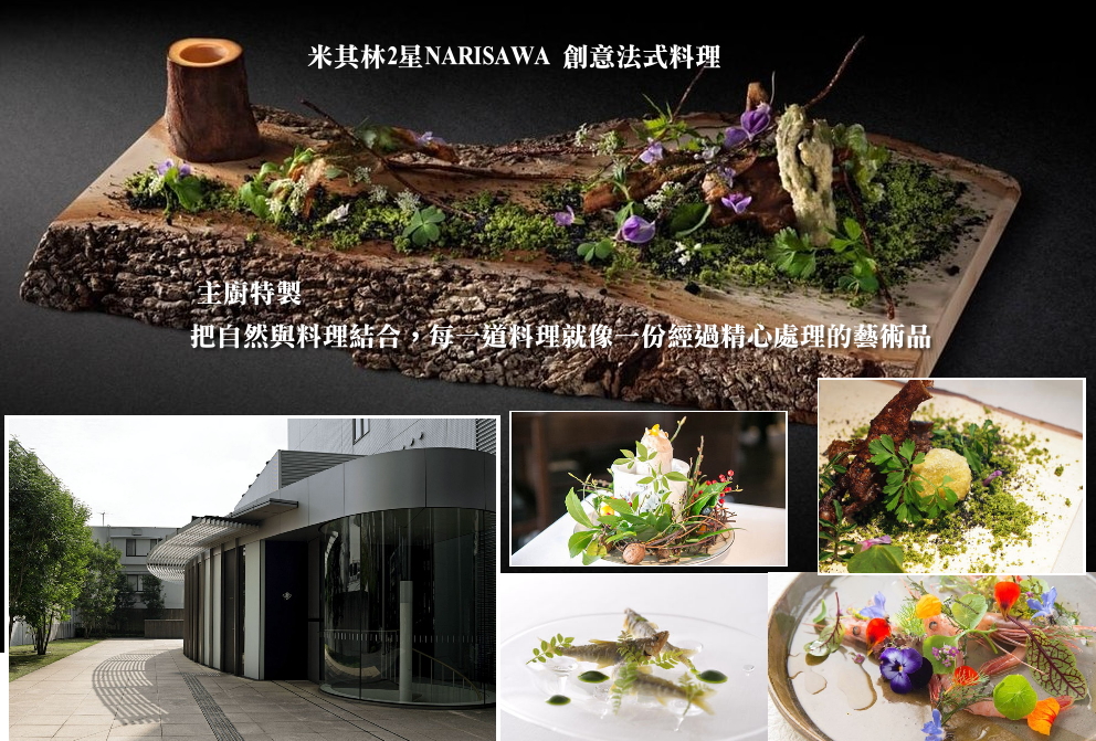 米其林二星 - NARISAWA餐廳 成澤由浩每天根據當天最新鮮當季食材為每位客人提供量身定制的 Omakase 風格的菜單 午餐供應Half collection 套餐,晚餐為Seasonal collection 套餐 有招牌前菜「里山的風景」、現場發酵的「森林的麵包」、海蛇高湯、黑炭「神戶牛扒」 炭烤鵪鶉配杏仁、將牛蒡根連同附著其上的泥土一起油炸製作出的招牌菜泥土湯「Soil 2001」等 10 多道菜品 把自然環境的概念,融入了所有料理之中。