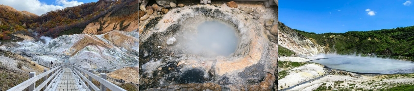 第 2 天 登別一日自由活動 (推薦自行前往的行程) :地獄谷 /登別熊牧場 /登別溫泉街 帝寶假期 之所以會安排今天做自由行,是因為我們希望您擁有在北海道最自由的一天,不需導遊、不要用車,景點在飯店區附近,近得都可以步行而至,讓北海道的行程擁有輕鬆愜意又可依照自己的時間來走。 推薦景點: 地獄谷 這個著名的景點距離我們住宿的酒店區大約1公里的距離,散個步就到了。 登別的名字來自於古老的阿依努語“ヌプルペッ”,意思是白色渾濁的河流。 地獄谷是登別溫泉的泉源,也是登別溫泉最著名的景點,火山地貌景色極為壯觀。 地獄谷是一個火山爆發的遺址,在這裡,火山氣體從灰黃色的岩石表面向外噴出,周圍空氣中充滿了濃烈的硫磺異味,而且這裡寸草不生,故名地獄谷。群山環抱,煙霧繚繞,再配上當地特產的手持狼牙棒的妖魔鬼怪們,置身其中,彷彿進入了耳鼻地獄。推薦參觀登別地獄谷的最佳時間是每天凌晨6點,團隊遊客不會出現,普通遊客也大多還在酣睡,整個地獄谷空蕩蕩的,可以看到初升陽光下的“生紫煙”效果。大湯沼繼續健行深入,有天然足浴,走累了泡個腳非常神清氣爽。